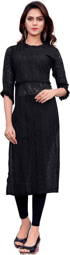 unique store Women Self Design Georgette Straight Kurta (Black)
