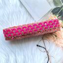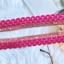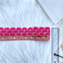 Measuring 9 meters in length, this lace border provides ample material to adorn multiple pieces or larger garments such as sarees, lehengas, and gowns. Its versatility makes it ideal for various applications beyond clothing, including home décor items like cushion covers, table runners, curtains, and wall hangings pink lace border, rani lace border, blouse lace design, zari work lace border, sequence lace, sitara lace.