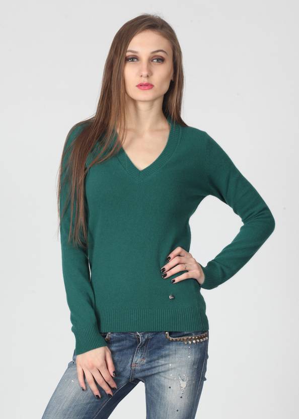 United Colors of Benetton Women Solid V Neck Green Sweater