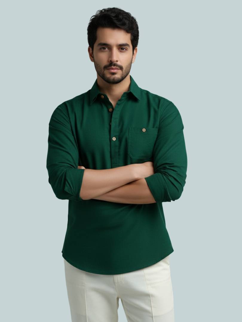 FireFish Men Solid Cotton Blend A-line Kurta (Dark Green)