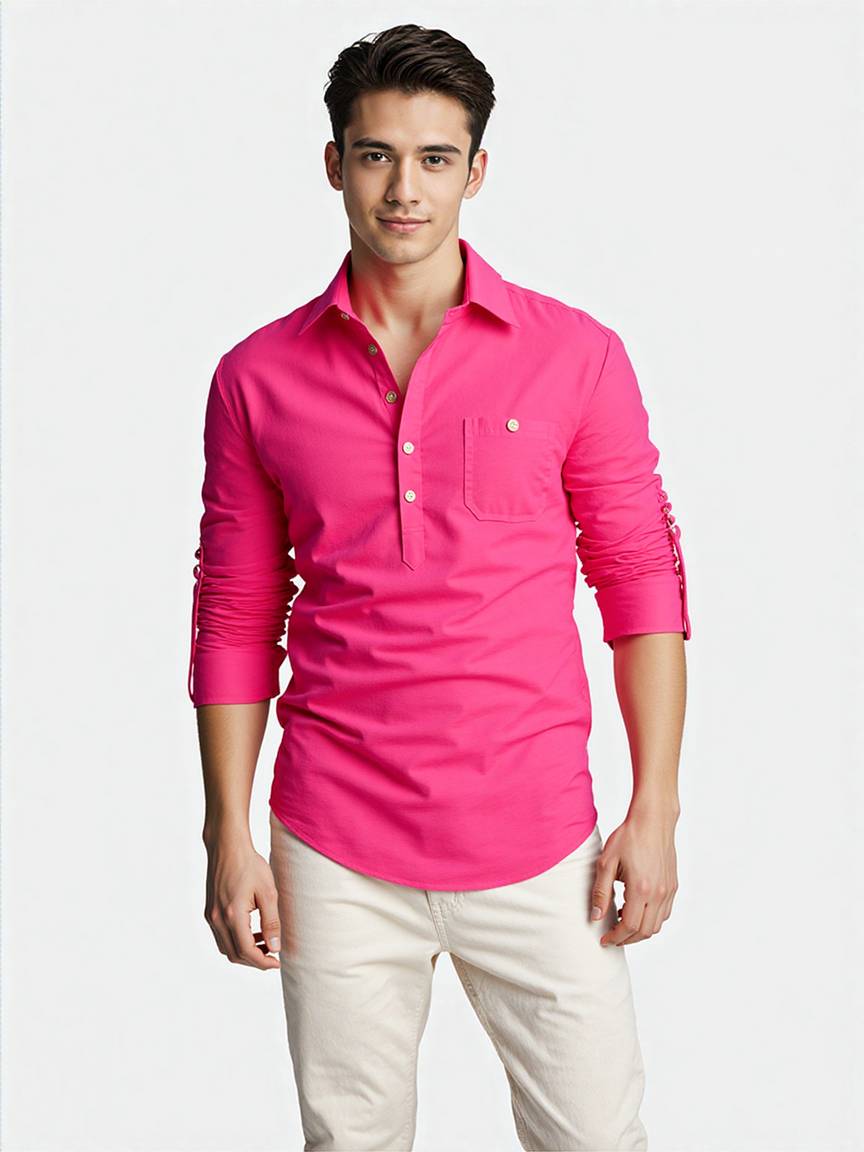 This pure cotton short kurta is perfect for men who value style and comfort. Its versatile design makes it ideal for any occasion—festivals, parties, or casual outings. Product Details 📋 👨‍🦰 Gender: Men 🎨 Pattern: Solid 🧵 Design Type: Plain 🔘 Closure: Button 👕 Sleeve: Full Sleeve (Roll-Up Option) ⬆️ Waist Rise: Mid-Rise 🪡 Collar: Spread Collor ✂️ Hemline: Curved 🌿 Fabric: Cotton Blend 📏 Product Length: Short 📦 Pack of: 1 Material & Care 🧺 Fabric: Cotton Blend Wash: Suitable for hand wash and machine wash. How to Style 🎯 Pair it with dark-wash denim or linen trousers for a casual look. Dress it up with a pair of churidar or slim-fit pants for festive occasions. Add leather sandals or loafers and a wristwatch for a classy finish. Roll up the sleeves for a relaxed vibe during daytime events. This short kurta seamlessly blends traditional elegance with modern styling, making it a wardrobe essential for every man! 👌"