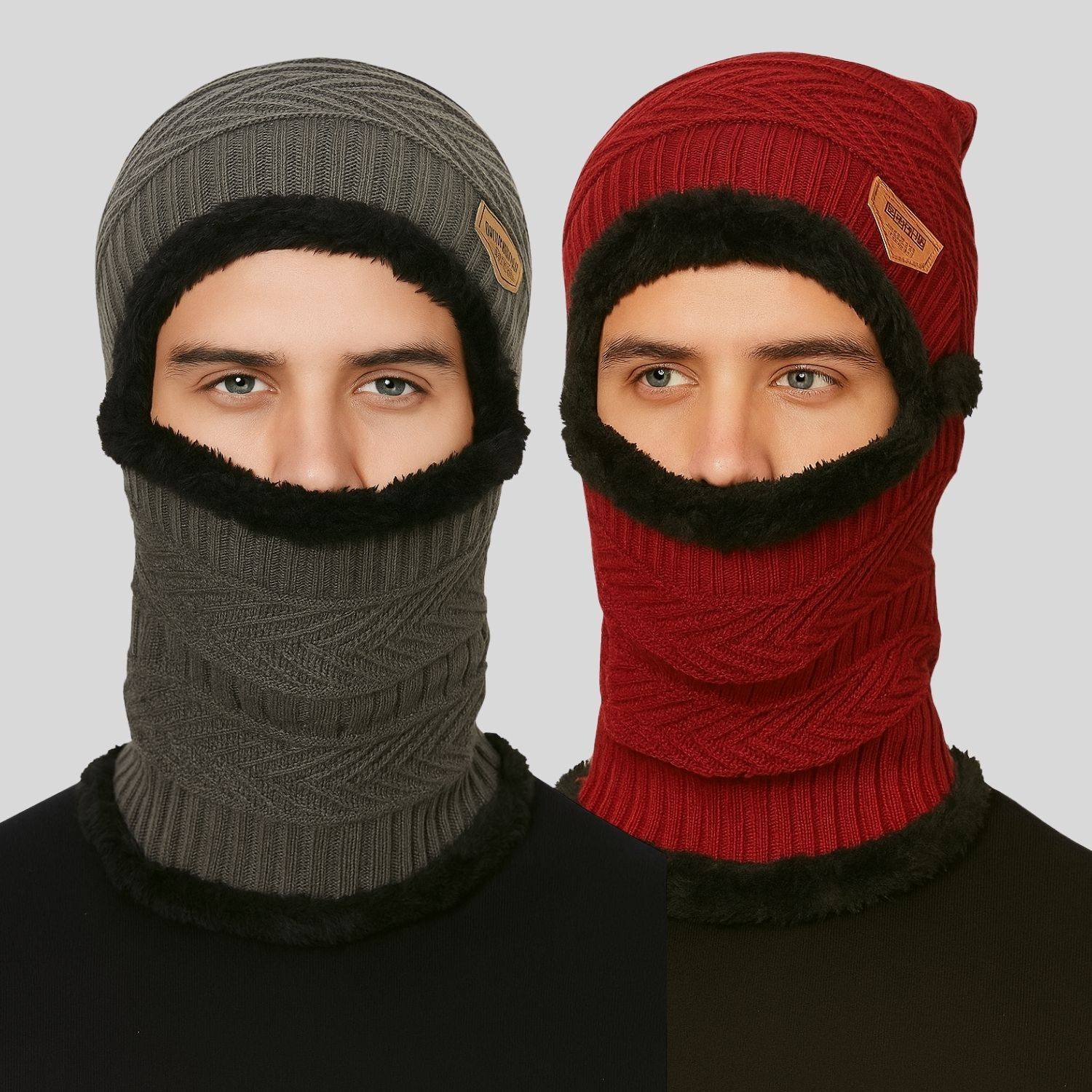 Stay fully protected and stylish this winter with this Combo Pack of 2 Men's Woollen Monkey Caps, designed with a premium self-design knitted pattern that adds a modern and bold winter look. Made from high-quality woollen fabric, these caps provide maximum warmth, complete face and neck coverage, and excellent comfit during cold weather.Each cap features a soft inner fur lining that feels gentle on the skin while delivering superior insulation. The regular-fit stretchable design ensures a secure and comfortable fit for all-day wear, making them perfect for biking, travel, outdoor work, trekking, daily use, and extreme winter conditions.This combo includes two versatile winter colors that pair effortlessly with all outfits. Warm, breathable, and stylish - this is the ultimate winter essential daily man needs.