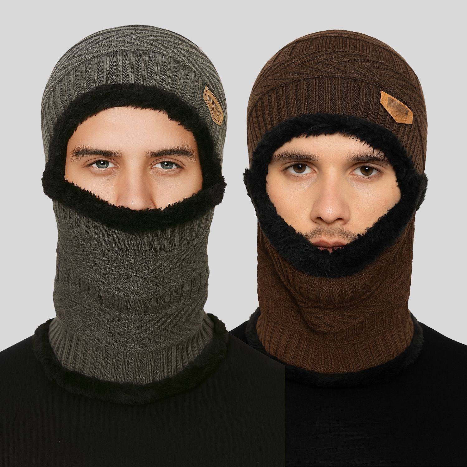 Stay fully protected and stylish this winter with this Combo Pack of 2 Men's Woollen Monkey Caps, designed with a premium self-design knitted pattern that adds a modern and bold winter look. Made from high-quality woollen fabric, these caps provide maximum warmth, complete face and neck coverage, and excellent comfit during cold weather.Each cap features a soft inner fur lining that feels gentle on the skin while delivering superior insulation. The regular-fit stretchable design ensures a secure and comfortable fit for all-day wear, making them perfect for biking, travel, outdoor work, trekking, daily use, and extreme winter conditions.This combo includes two versatile winter colors that pair effortlessly with all outfits. Warm, breathable, and stylish - this is the ultimate winter essential daily man needs.