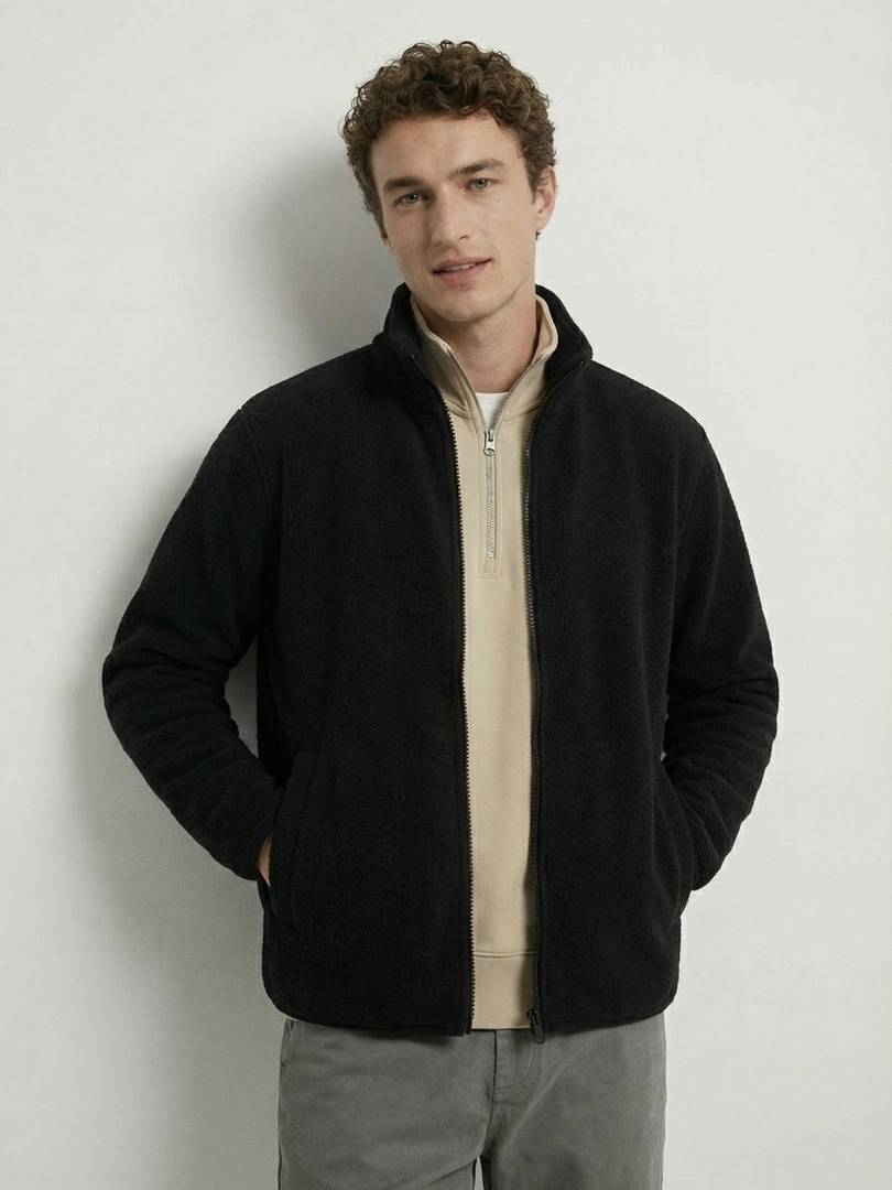 Stay warm and stylish in this black solid fleece zip-up jacket designed for everyday winter comfort. Featuring a high-neck design, full sleeves, two side pockets and a soft fleece build, this jacket offers lightweight warmth and an easy-going casual look.