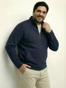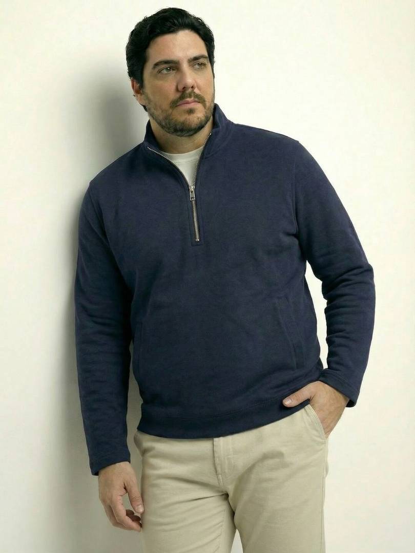 This navy blue sweatshirt features a practical quarter-zip closure and a comfortable stand-up collar, making it a versatile addition to any casual wardrobe. Crafted from a soft, presumably cotton-blend fabric, it offers a relaxed fit for everyday comfort. The design includes a convenient kangaroo pocket on the front. This sweatshirt is ideal for layering over a t-shirt and pairs well with various bottoms such as jeans, chinos, or other casual trousers. Complete the look with sneakers or casual footwear for a laid-back yet stylish ensemble.