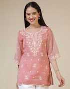 Uparna is well known brand of amazing range of women's ethnic wear in soft and solid colors that looks perfect for any occassion.With beautiful designs and patterns our apparels are very stylish and comfortable too.Get rid of the 'regular' look this season wearing this trending kurta by Uparna.This Straight Hip Length Light Pink colored Chikankari Embroidery, Lace kurta comes with 3/4 Sleeve and V Neck.Kurta Fabric : Silk Blend , Kurta Work : Chikankari Embroidery, Lace , Kurta Color : Light Pink