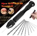 Mini Micro Aluminum Hand Drill With Keyless Chuck +10 Twist Drills Rotary Tools Features -For aluminum Hand Drill hobby -Mini wood hand drill chuck for jewelry tool micro twist bit -Precise, Accurate and Efficient -Suitable for wood, plastic,rubber,model and others material to drilling hole. -Do not fit steel, iron,stone,such hard things -Perfect for Drilling Wood,Jin Gang,Linden,Horn,Amber,Olive,Walnut,Plastic and other materials. Specifications Material: Aluminium Alloy Color :Black Chuck Clamping Range:0.3-3.2mm High precision,can clip 0.3 -3.2mm drill bit. 10pcs Mini Twist Drill Bits Material: High Speed Steel Size:0.5 0.6 0.7 0.8 0.9 1.0 1.2 1.5 1.8 2.0mm suitable for PCB, crafts, jewelry, watch making Mini Micro Drill Bit Set Pcb Hobby Micro HSS High Speed Steel Straight shank Twist Drill Bits Mini Drill Bits,Electric Drill Power Tools Package included 1 x Hand Drill+10 pcs twist Drills