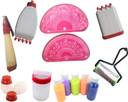 Upyukat Rangoli making kit- (2pcs of semi Circle Rangoli Stencils (35X20 cm), 1 Big & 2 Small Rangoli fillers, 1 Rangoli Pen, 1 Rangoli Roller, 1 Galicha patta, 1 Rangeela patta and 5 Colour Bottles Rangoli Stencil