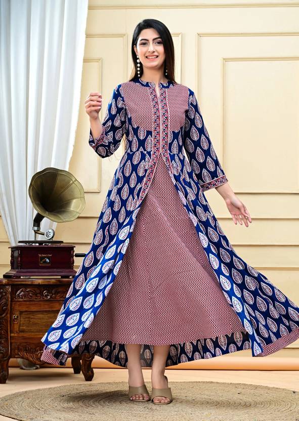 Cotton Rayon Stitched Anarkali Gown (Blue, Red)