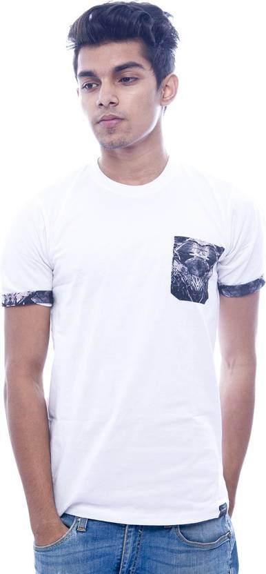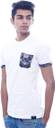 Urban Flux White with Navy Abstract Pocket & Sleeve Turn-Up Fitted Men Solid Round Neck Cotton Blend White T-Shirt