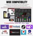 | Key Features | - V8 Sound Card with Dual DSP Noise Reduction Chip and ECHO: There are dual DSP noise reduction chips inside the sound mixer voice changer to avoid the influence of current noise, ensure high quality sound, and sing beautiful songs, Reverb (ECHO) makes your voice more charming., Live Sound Card with Multiple Effects and Voice Change Modes: 6 mode selections, 12 electro-effects options, 12 funny sound effects, 7 different gameplays, 3 Voice Changer, A central LED display showing levels for microphone, music, and headphones, using green, orange, and red indicators., Large rotary knobs labeled for Treble, Bass, Accompany, Record, Monitor, Mic, and Echo, which likely adjust sound levels and effects., A power button with a blue and red light ring around it.