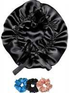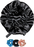 URBAN OX Satin Hair Bonnet for Sleeping adjustable Tie band – 3 Scrunchies Set | Reusable Hair Accessory Set (Black)