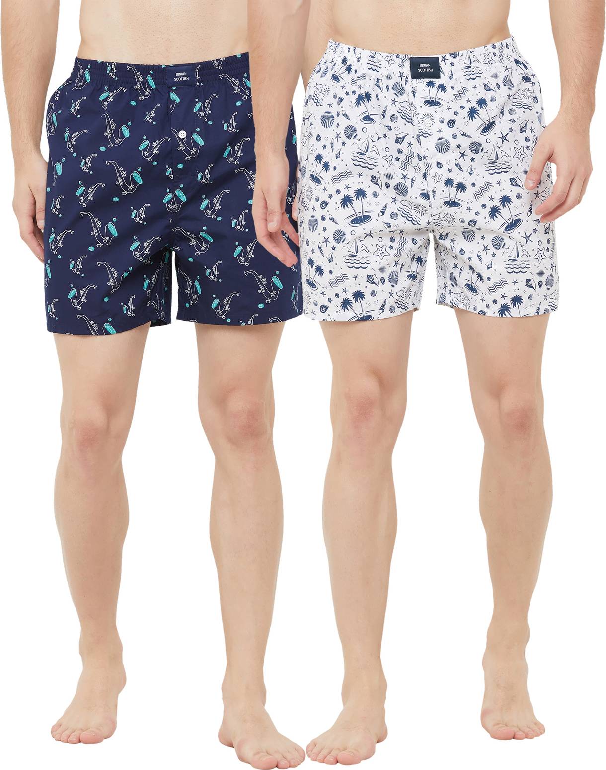 Experience a new level of comfort with these super soft printed boxers, pack of two, from the brand Urban Scottish. It is perfect for all the seasons. Both are featured with an elasticated waist to provide better fitting,concealed button placket, a fly opening and a fun print all over. It can be worn as an inner wear as well as shorts for relaxed lounging or a beach vacation. It is made with pure cotton and ensures complete ease to the skin. Team it with a matching t-shirt or a vest to complete the look.