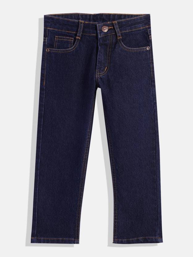 Stylish & In-vogue Washed Dark Blue Boys Jeans, Cotton Lycra with Stretch (98% Cotton 2% Elastane) - Offers extra comfort and flexibility, Adjustable Elastic on inner waistband for better Fit and Comfort, Slim Fit, Mid-Rise, Regular Length, Zip Fly with Buttoned Closure, Front Curved Pockets, Perfect for Casual, Party & Evening Wear, Wash Care - Mild Wash ; Wash dark colors separately