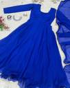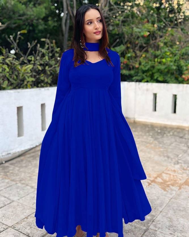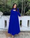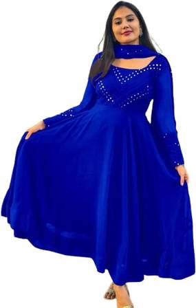 Step into timeless elegance with this flowy georgette gown, paired with a graceful matching dupatta. Designed in a rich and vibrant royal blue shade, this outfit is perfect for making a bold yet classy statement. The crepe inner lining ensures all-day comfort with a smooth, flattering fit.