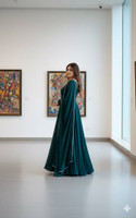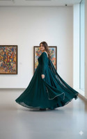 An Anarkali-inspired structure of this set's gown showcases a flowing silhouette designed to flatter through its gentle flare. The round neck with a stylish back-tie detail creates an adjustable and secure fit that works well for extended wear. Furthermore, including the long sleeves contributes to a refined appearance, and the full-length fall adds a sense of continuity from neckline to hem.