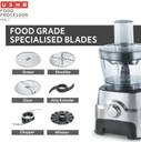 Equipped with sharp stainless steel blades, this food processor effortlessly slices, chops, and shreds food items into thin, chunky, or small pieces. And, these blades are attached to a disc holder to stop them from shaking while in use, ensuring your safety.