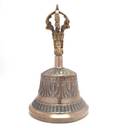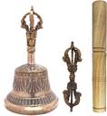 The Nepali bell with dorje and stick, commonly known as a singing bell, is a traditional musical instrument originating from Nepal and the Himalayan region. Crafted from a blend of metals like copper, tin, zinc, and iron, it features a wide, shallow bowl-like shape with a rounded bottom and decorative engravings, often holding spiritual or cultural significance. Accompanying the bell is the dorje, a small metal scepter with a cross shape symbolizing strength and enlightenment. The stick or mallet, usually made of wood with a soft material on one end, is used to produce sound by gently rubbing or striking the bell's rim. The singing bell is widely used in spiritual and meditation practices for its calming and therapeutic tones, inducing relaxation and aiding in healing. It holds deep cultural significance and plays a crucial role in various ceremonies in Nepal and the Himalayan region, making it a cherished object that embodies art, culture, and spirituality.