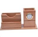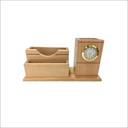 V A Antiques 3 Compartments Pen Stand + Mobile Stand + Card Holder, Multipurpose Desk Organizer with Clock (Wooden)