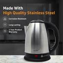 As this electric kettle is built with a stainless steel body, it is rust-resistant to ensure long-term use. Additionally, it also features a concealed hairpin tubular heating element that uniformly distributes heat to quickly make the beverage of your choice.