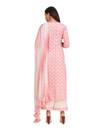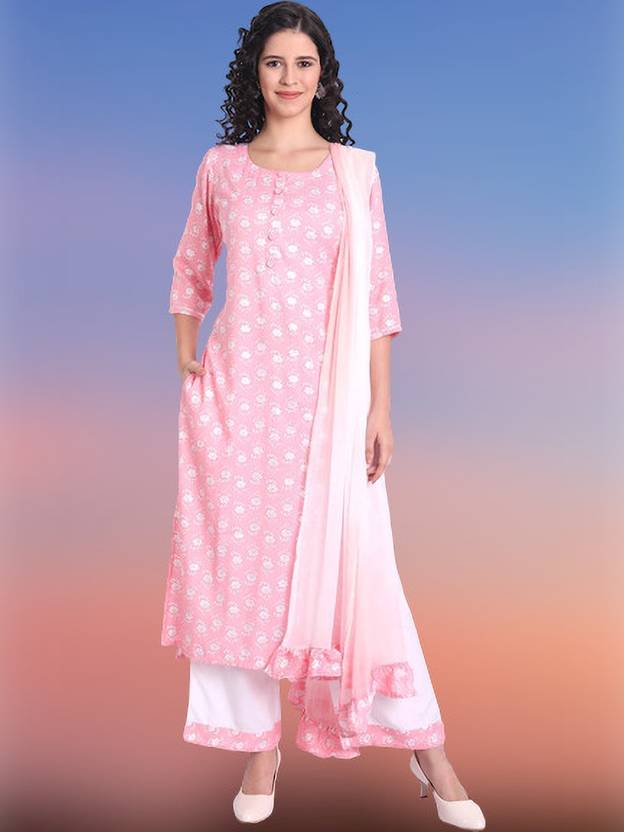 this set includes kurta,palazo and dupatta ,pink floral print kurta has straight calf length kurta ,round neck,three quarter sleeves with gota and cream palazo has partially elasticated waist band and pink and white dupatta with frill …