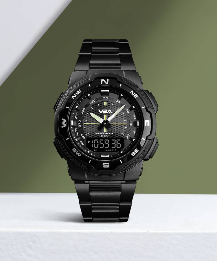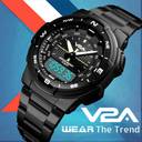 V2A LUXURY SPORT WATCHES: V2A is dedicated to design and exquisite workmanship of high-quality sports watches. Its classic design of multi display watches and comfortable stainless steel material can provide its users excellent outdoor experiences. By mixing sporty chic together with multifunction, V2A Luxury Sports series has become our most popular product. Main Features: - Original Japanese quartz and electronic movement with the original battery makes it more precise and enduring, Supports dual time function which helps you to set another place time, Fully-functional light allows you to use the watch in the dark, Water resistant at 50m and is convenient to swim, take a cold shower or wash something with. Item Type: Wrist Watch, Dial Window Material Type: Hardlex Glass, Water Resistance Depth: 50 m, Clasp Type: Clasp Buckle, Style: Fashion & Casual & Sport, Gender: Male, Dial Display: Analog-Digital, Case Shape: Round, Band Material Type: Stainless Steel, Dial Diameter: About 4.7cm, Case Thickness: About 1.4cm