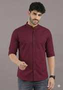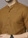 This men's shirt features a solid mustard yellow color and a stylish mandarin collar. It has a full button-down front with contrasting black buttons and full sleeves that can be rolled up to a 3/4 length. The fabric appears to be a comfortable, breathable material, making it suitable for casual wear. It pairs well with jeans, chinos, or casual trousers.