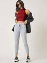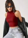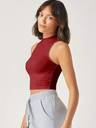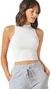 Make a statement with this knit top featuring a mock neckline, sleeveless, and a crop straight closure at the hem. This casual yet chic top would look perfect paired with a denim mini skirt, round sunglasses, and ankle booties.