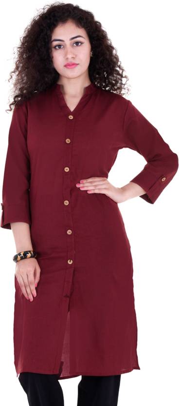 VAIDIKI Presenting This Plain Cotton Solid Kurtas For women. Colorful Solid pattern Straight Fit kurta with Wooden Button and Frontslit Style. The kurta has mandarin collar V-Neck & Roll-Up sleeves type . Pair it with flats and minimal jewellery for classic look. Kurta Length:-42 Inches.