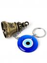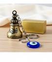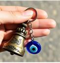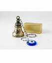 This Guardian Bell Keychain is a handcrafted charm featuring an intricately engraved bell attached to a sturdy key ring, accompanied by a vibrant blue evil eye bead for added protection, and presented in an elegant golden box. It serves as a thoughtful gift symbolizing blessings and good luck, often used to ward off negative energies and evil spirits. The bell's gentle chime is believed to attract positive vibes and ensure safe travels for the recipient.