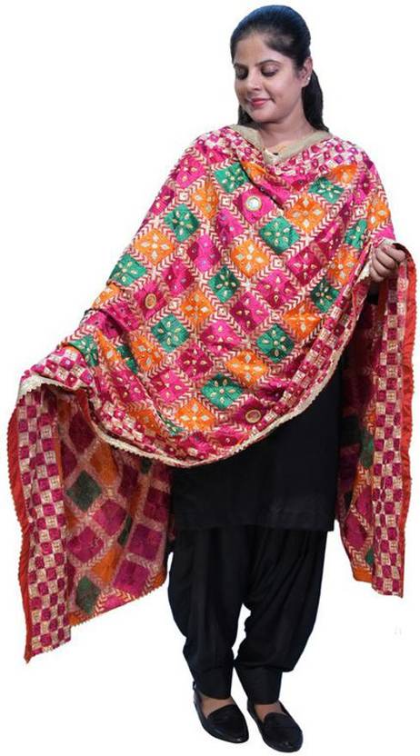 Make A Style Statement This Season With This Beautiful Dupatta From Valaika Design. This dupatta is made from Chiffon Phulkari. It is the perfect fashion accessory for any season, event, or occasion! It is lightweight, soft, and comfortable. This chiffon dupatta is a visual treat, exalting a rich look. A perfect gift for women and girls for all occasions. We Believe Fashion Is Eternal And Our Product Reflects Our Personalities. Indian Ethnic Wear Has Always Been Associated With Elegance, Grace, And Beauty. It comes in One-Size to fit all with 42 inches in width & 2.3 meters in length. This Ethnic Dupatta For Women Will Make It Your Favorite Tag Along Accessory For Any Occasion, Either Casual Wear Or Office Wear. Pair It With Your Kurta And Bottoms With Heels For A Perfect Look. Wearing Guide Drape it over both shoulders as an accessory. Drape it on a single shoulder as a shawl. Pair it with a Kurti or salwar suit for the ideal look. This Phulkari work dupatta is essential for your wardrobe to lend it a traditional touch. It is an exquisitely handcrafted piece with beautiful multi-color embroidery. It also has a very smooth and soft texture. It can be teamed with any simple contrast-colored dress. Drape this dupatta to give any attire a festive and upbeat look on any occasion. Match this multicolor phulkari chunni with any suit that you have in your wardrobe and become a piece of attraction in front of everyone. Team up this dupatta with both ethnic and western outfits for timeless signature styles. A perfect gift for women and girls for all occasions. This beautiful hand-crafted dupatta is made from phulkari. Width - 42 Inches | Length - 2.3 Meters