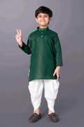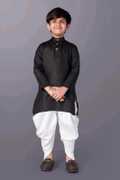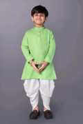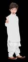A simple, elegant ethnic set that quietly reveals class by taking the uncomplicated route with an elegantly solid kurta over a pajama. This set can look good on its own or paired with the right accessories. Truly an evergreen outfit, your kid can flaunt this at family functions, traditional occasions, and other celebrations.