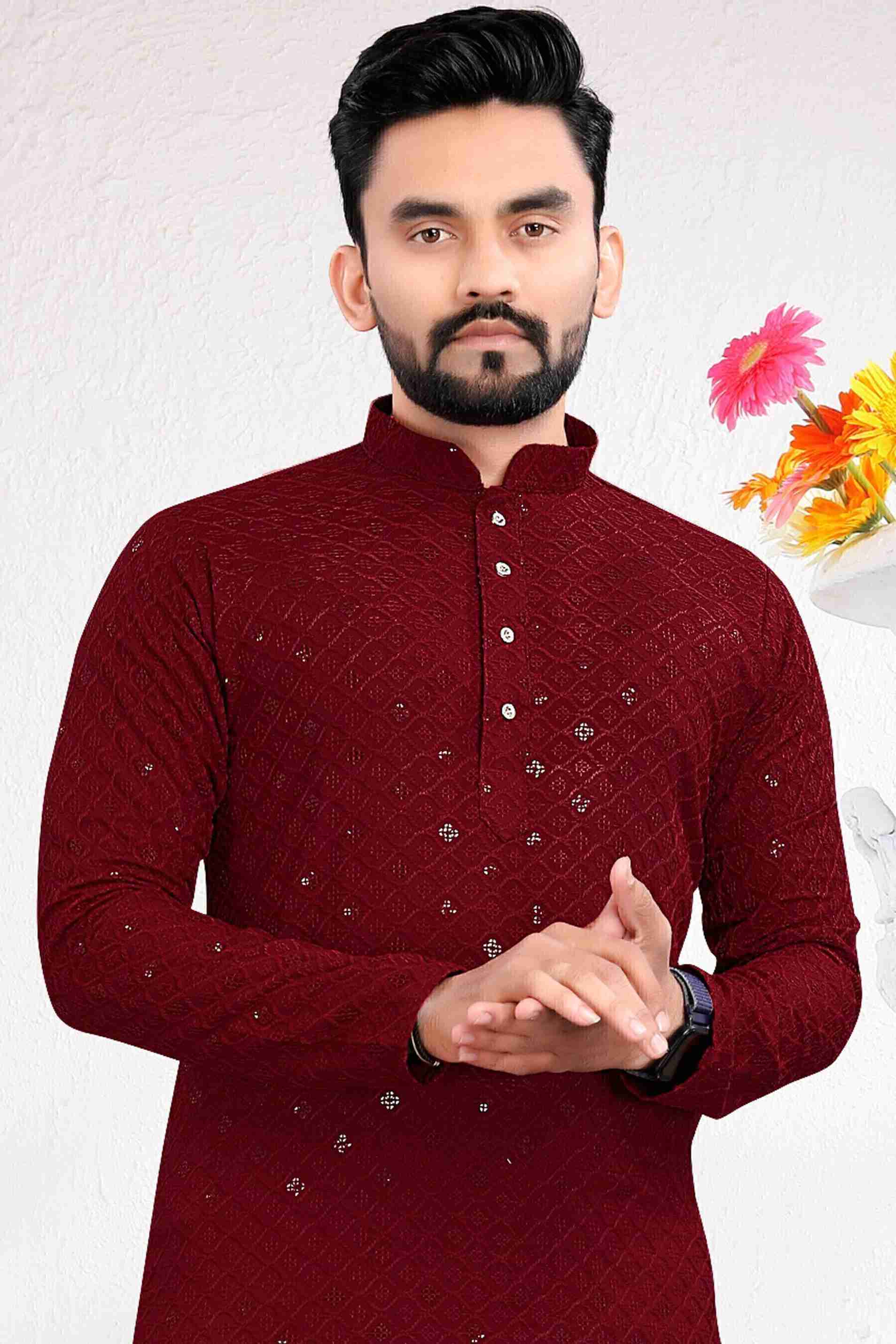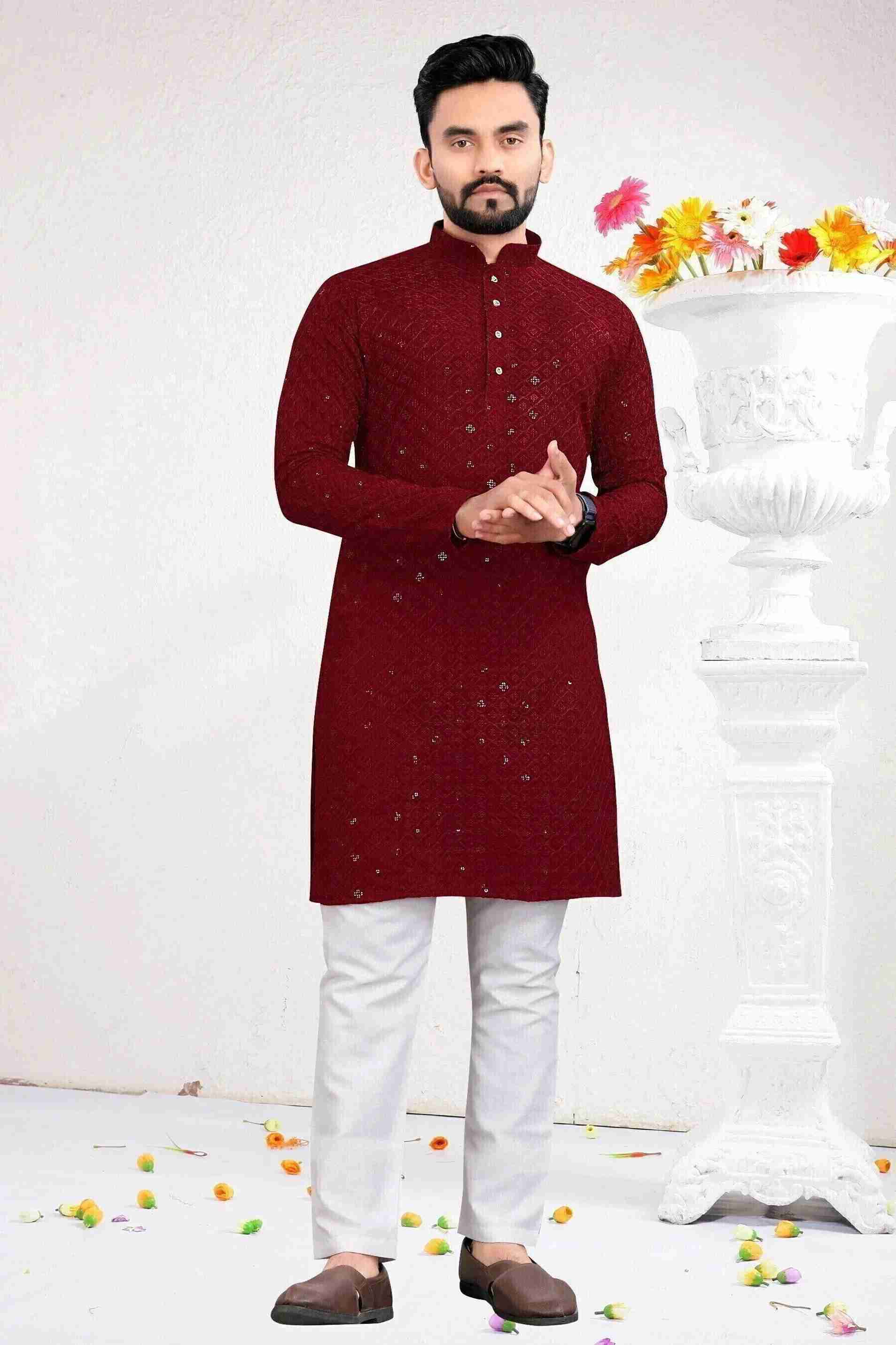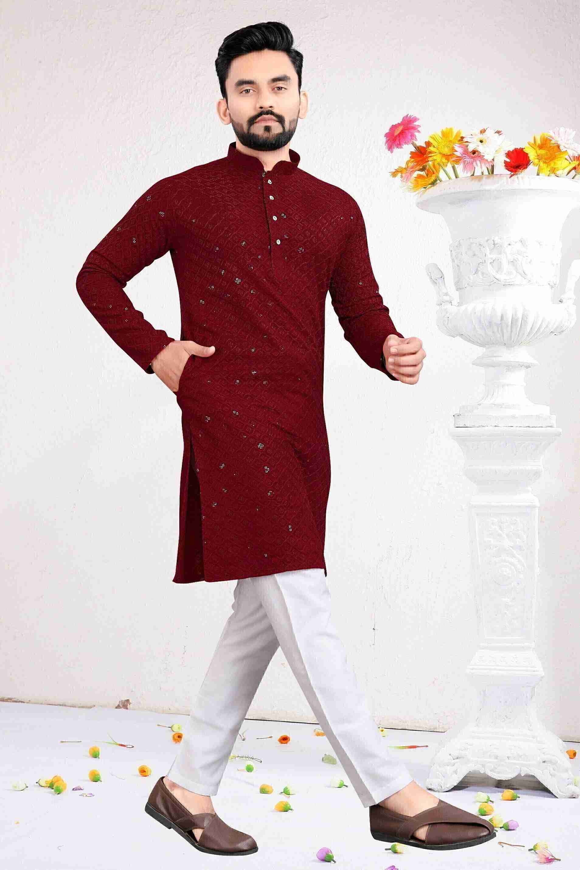 Enhance your wedding look with this maroon kurta and pyjama set featuring exquisite embellishments. The intricate detailing adds a touch of sophistication to your ensemble.