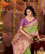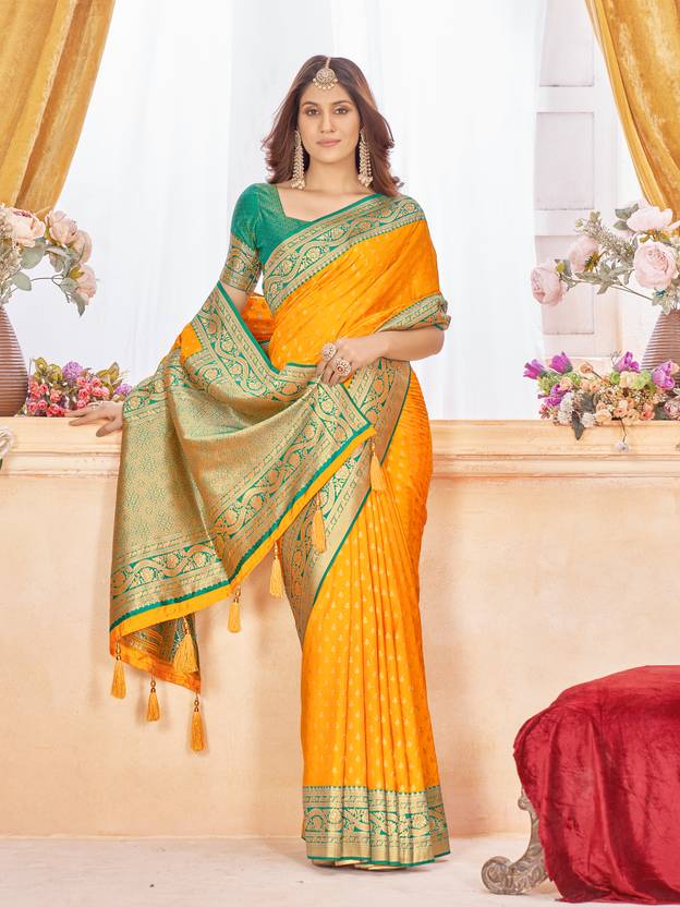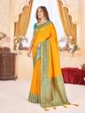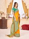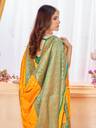 Exquisite Hand-painted Art: This saree showcases intricate hand-painted designs, a true testament to the artistry and craftsmanship of Indian artisans., Luxurious Silk Fabric: Crafted from premium silk, this saree offers a luxurious drape and a soft, smooth texture against the skin., Embroidered Embellishments: Adorned with delicate embroidery work, this saree adds a touch of elegance and sophistication to your ethnic ensemble., Unique Patch Border: The saree features a distinctive patch border, adding a touch of uniqueness and enhancing the overall visual appeal., Versatile Styling: Whether for a festive occasion or a formal event, this saree can be styled in various ways, making it a versatile addition to your ethnic wardrobe.