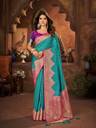 Elegant Design: This exquisite saree features a teal-green base adorned with intricate gold zari embroidery and a contrasting magenta border for a regal look., Rich Fabric: Crafted from premium silk material, the saree boasts a lustrous sheen and a soft, comfortable drape., Festive Occasion: Perfect for weddings, festivals, and special occasions, this saree will make you the centre of attention., Versatile Style: The vibrant colours and ornate detailing allow you to accessorise this saree in various ways to suit your personal taste., One Size Fits Most: With its generous length of approximately 6 metres, this saree can be draped comfortably by most individuals.