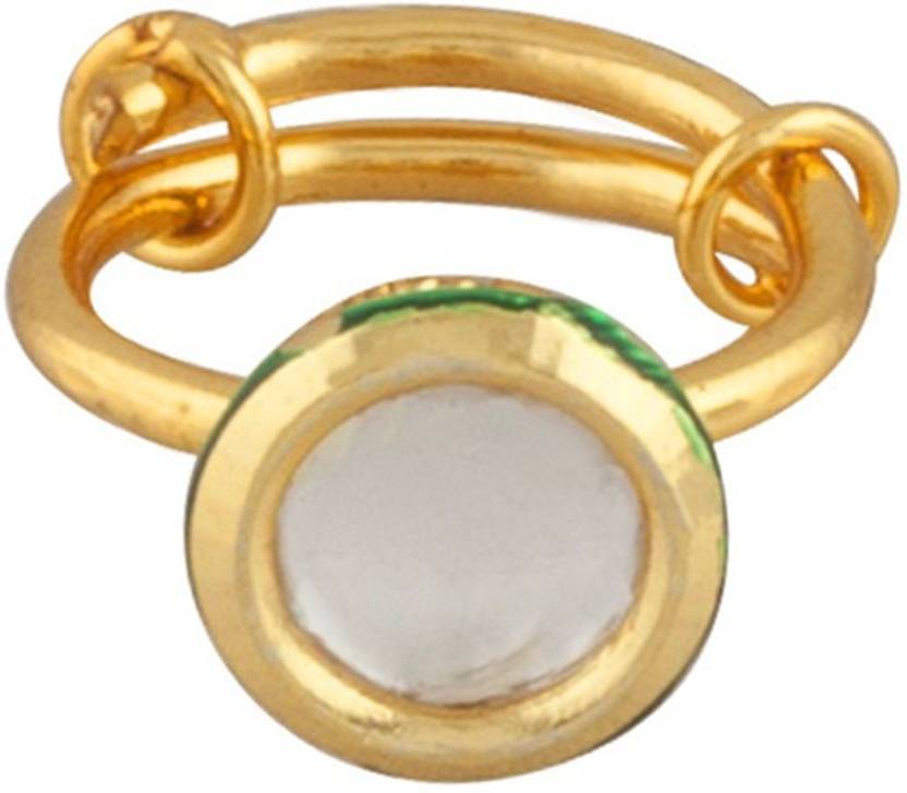 One Gram Gold Plated White Kundan Pachikam Stone Adjustable Finger Ring::The Finger Ring is Made in Mixed Alloy::The Finger Ring is Adjustable in Size and can be worn by any Women::The Stones Used are Semi Precious White Kundan Pachikam Stones