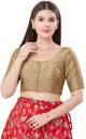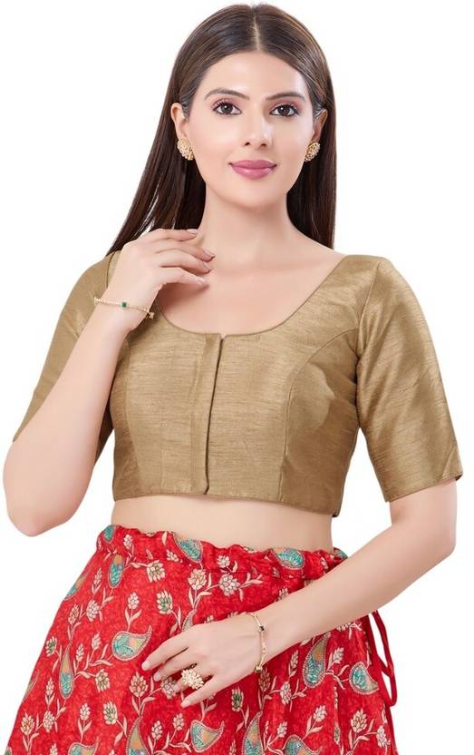 A must-have plain dupion silk saree blouse featuring a flattering princess cut and convenient front hook closure. The elegant round neckline is mirrored in the back, accented by a stylish dori tie-up. Available in a range of beautiful colors to complete any saree look.