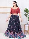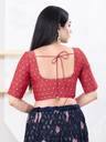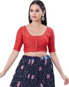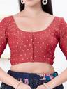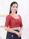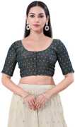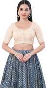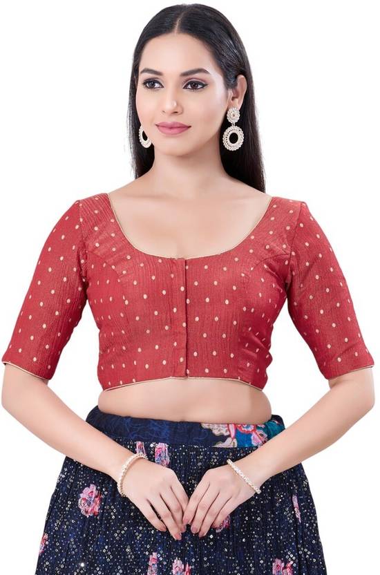 This ethnic saree blouse features a stylish front open round neck and a comfortable princess cut in a distinctive crush tissue fabric embellished with zari buttas. Effortlessly chic and perfect for adding a touch of tradition to your ensemble.
