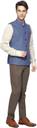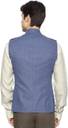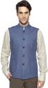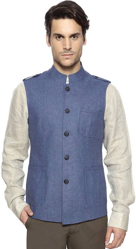 Blue Nehru jacket, has a mandarin collar, a full button placket, sleeveless, three patch pockets, double vented hem. Look your absolute best in this super-stylish waistcoat from Van Heusen. Layer it over a T-shirt or a shirt, wear a pair of jeans and casual shoes for a smart appeal.