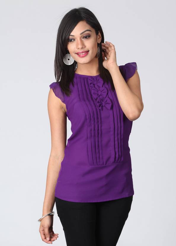 Looking sizzling hot has become a cakewalk with this The Vanca Top in your closet. The solid purple top has tucks in the front along with bow detailing which makes it ritzy. To complete that dapper attire, pair this top with chinos and stilettos.