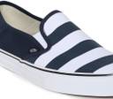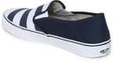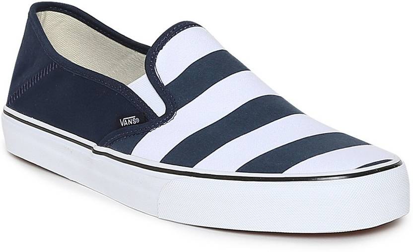 A pair of white and navy blue striped slip-on sneakersCanvas upperCushioned footbedTextured and patterned outsoleWarranty: 3 months against manufacturing defectsWarranty provided by Brand Owner / Manufacturer. Trendy casual shoes from Vans will give your style a whole new look. When youre grabbing drinks with the guys, pair these white shoes with chinos and a casual blazer.