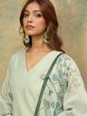 Olive Floral Printed Thread Embroidered Scallop V Neck, Three Quarter Sleeves Straight Kurta Paired With Tonal Bottom And Printed Dupatta