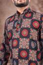 Color:Black, Length:Hip-Length, Pattern:Block-style Geometric & Floral Motif Print, Fabric:Pure Cotton, Print Type:All-over Block-Inspired Digital Print, Hemline:Curved Hem, Slit Detail:No Side Slits (Shirt-style kurta), Closure:Buttoned Placket, Comfortable full sleeves and shirt-length for semi-casual look, Vibrant motifs with heritage influence in bold color scheme, Easy to style with white, beige or denim bottomsIdeal for small functions, festive gatherings, casual traditional days, or cultural events.