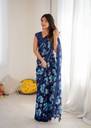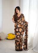 Make a stunning style statement with this elegant black chiffon saree adorned with a mesmerising coral floral print. The delicate blooms scattered across the dark background create a sophisticated contrast that's perfect for both festive occasions and formal events. The saree features a sleek V-neck sleeveless blouse that adds a contemporary touch to this traditional attire. Crafted from lightweight chiffon fabric, this saree offers graceful draping and comfortable wear throughout the day. The harmonious blend of black and coral creates a versatile piece that can be accessorised in multiple ways. Small tassels along the border add a playful finishing touch. The transparent nature of chiffon allows for subtle glimpses of the print's layering, creating a beautiful depth effect. Perfect for evening functions, parties, or special occasions where you want to make an elegant impression. The saree comes with a matching sleeveless blouse piece that can be tailored to your preferences.