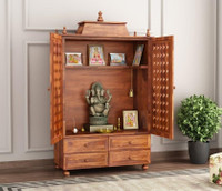 Boasting a versatile design, this temple includes shelves, a door, and drawers, providing ample storage space for a variety of items. Besides housing your revered deity, it can offer secure storage for books, toys, showpieces, religious essentials and more. Therefore, this versatile furniture can become a practical and functional addition to any home.