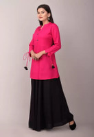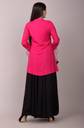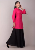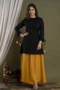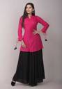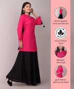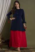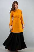 Both the kurta and skirt are fashioned from viscose rayon. It offers a soft, breathable, and comfortable feel against the skin. Its smooth texture drapes elegantly, making it a popular choice for clothing. This combination of comfort and aesthetics makes viscose rayon a favoured material for both the kurta and skirt, ensuring a stylish and comfortable set.