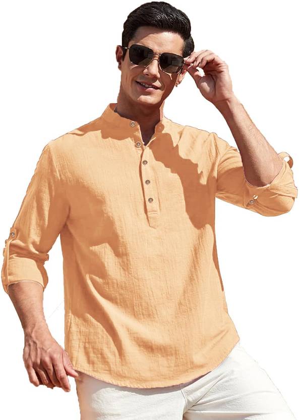 This Cotton Blend short kurta is perfect for men who value style and comfort. Its versatile design makes it ideal for any occasion—festivals, parties, or casual outings. Product Details 📋 👨🦰 Gender: Men 🎨 Pattern: Solid 🧵 Design Type: Plain 🔘 Closure: Button 👕 Sleeve: Full Sleeve (Roll-Up Option) ⬆️ Waist Rise: Mid-Rise 🪡 Collar: Mandarin/Chinese ✂️ Hemline: Curved 🌿 Fabric: Cotton Blend 📏 Product Length: Short 📦 Pack of: 1 Material & Care 🧺 Fabric: Cotton Blend Wash: Suitable for hand wash and machine wash. How to Style 🎯 Pair it with dark-wash denim or linen trousers for a casual look. Dress it up with a pair of churidar or slim-fit pants for festive occasions. Add leather sandals or loafers and a wristwatch for a classy finish. Roll up the sleeves for a relaxed vibe during daytime events. This short kurta seamlessly blends traditional elegance with modern styling, making it a wardrobe essential for every man! 👌"