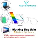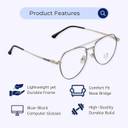 These latest Topbar Aviator frame blue light blocking glasses provide a stylish way to reduce eye strain from screens. The lenses effectively filter out harmful high-energy visible (HEV) blue light emitted from digital devices, allowing you to work or relax comfortably for extended periods without squinting or fatigue. The lightweight frames feel comfortable for all-day wear, keeping eyes protected whether browsing on your phone, working at a computer, or binge-watching your favorite shows. Anti-scratch and anti-reflective lenses offer clear vision. Subtle yet sophisticated in silver, these glasses make reducing digital eye strain as easy as putting them on. You can easily replace lenses to any power glasses from your local optician.