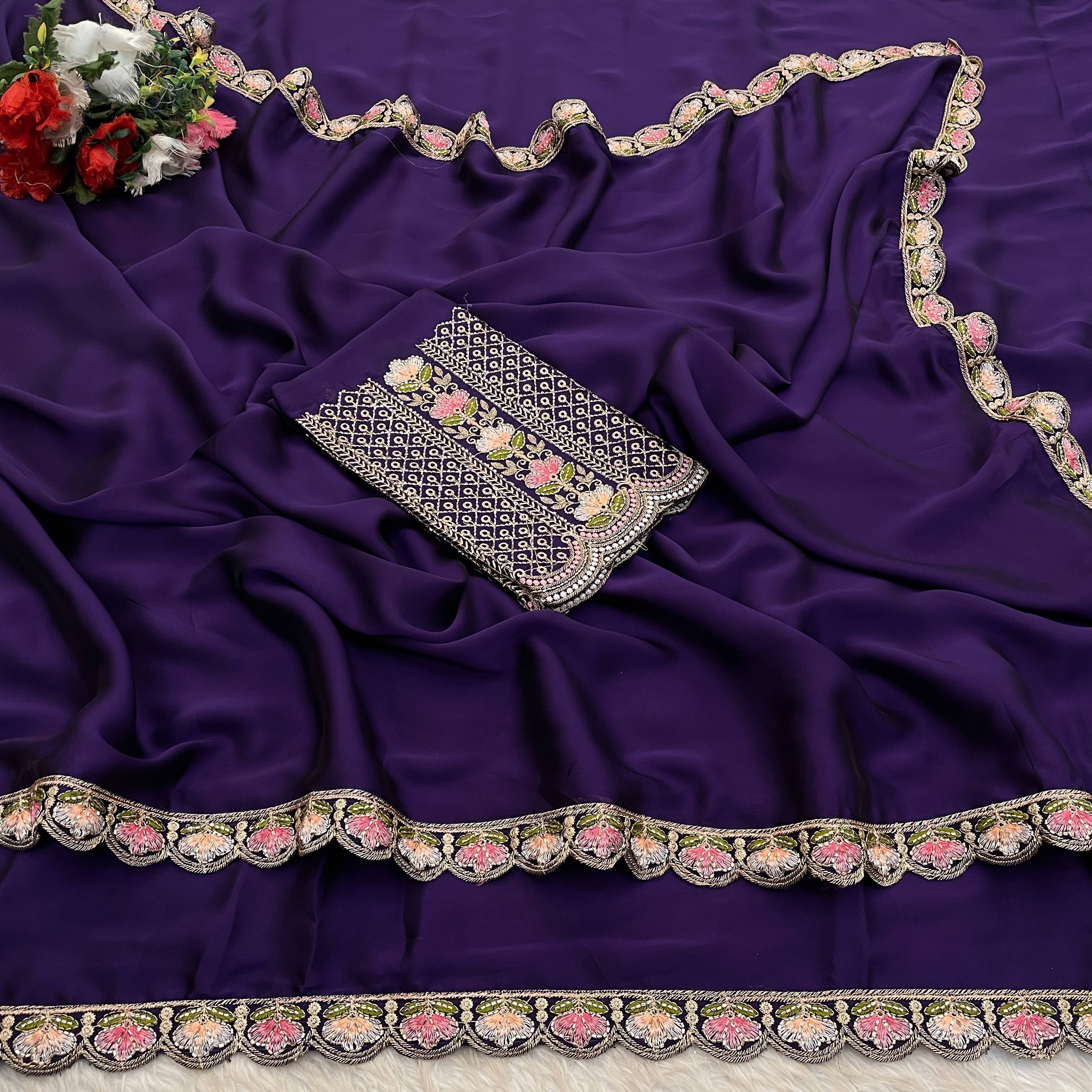 Make a bold style statement with this luxurious Lavender colored saree. Crafted from flowy, premium Silk fabric, this saree offers a graceful drape that is perfect for special occasions. The saree features a trendy scalloped cut-work border adorned with delicate floral embroidery in contrasting pastel pink and peach threads. It is paired with a stunning, heavy-work unstitched blouse piece that features a rich geometric lattice (jali) pattern and a central floral vine, ensuring you look elegant from every angle. Ideal for weddings, receptions, and festive celebrations.