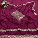 Make a bold style statement with this luxurious Falsa colored saree. Crafted from flowy, premium Silk fabric, this saree offers a graceful drape that is perfect for special occasions. The saree features a trendy scalloped cut-work border adorned with delicate floral embroidery in contrasting pastel pink and peach threads. It is paired with a stunning, heavy-work unstitched blouse piece that features a rich geometric lattice (jali) pattern and a central floral vine, ensuring you look elegant from every angle. Ideal for weddings, receptions, and festive celebrations.